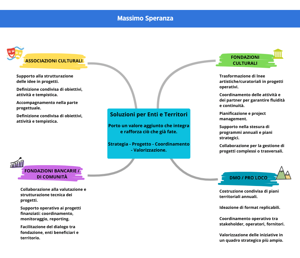 Affianca enti pubblici, istituzioni culturali, fondazioni e realtà territoriali nello sviluppo di progetti che valorizzano comunità e territori.